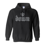 Classic, heavy blend pullover hoodies feature a double lined hood with a matching drawstring and are preshrunk for a softer feel and reduced pilling, as well as a double needle stitch for durability. It's made from 50% cotton, 50% polyester fleece knit. Features a DOWN Grey Fleur De Lis design. Care Instructions: Machine wash and tumble dry on low.