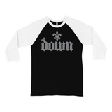 The classic baseball tee with raglan 3/4 sleeves and crew neck with contrast trim is an ideal choice for printing. It's made from 52% Airlume combed and ring spun cotton and 48% poly blend, 40 single, 3.6 oz. Features a DOWN Grey Fleur De Lis design. Care Instructions: Machine wash and tumble dry on low.